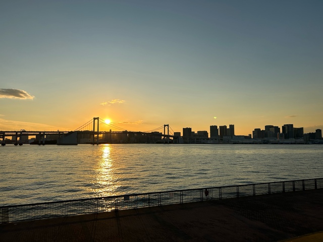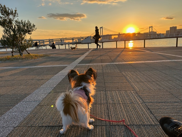 ロングリードをつけて咲那と軽いジョギング。海が大好きな咲那は大喜びで全力疾走です。陽が傾いてくると、膝の上に咲那を乗せてのんびりと東京湾の夕景を眺めます。「さあ、明日も頑張ろうか。」と思う瞬間です。