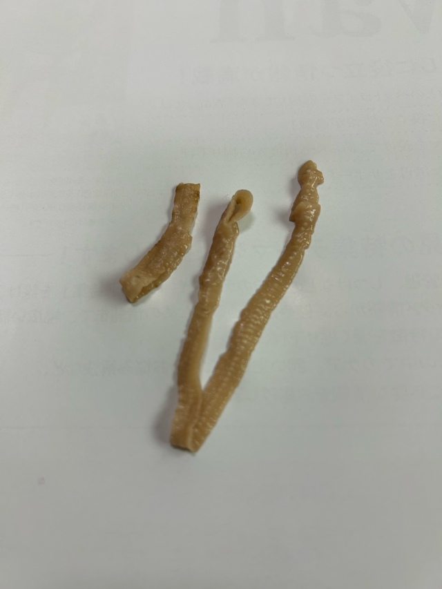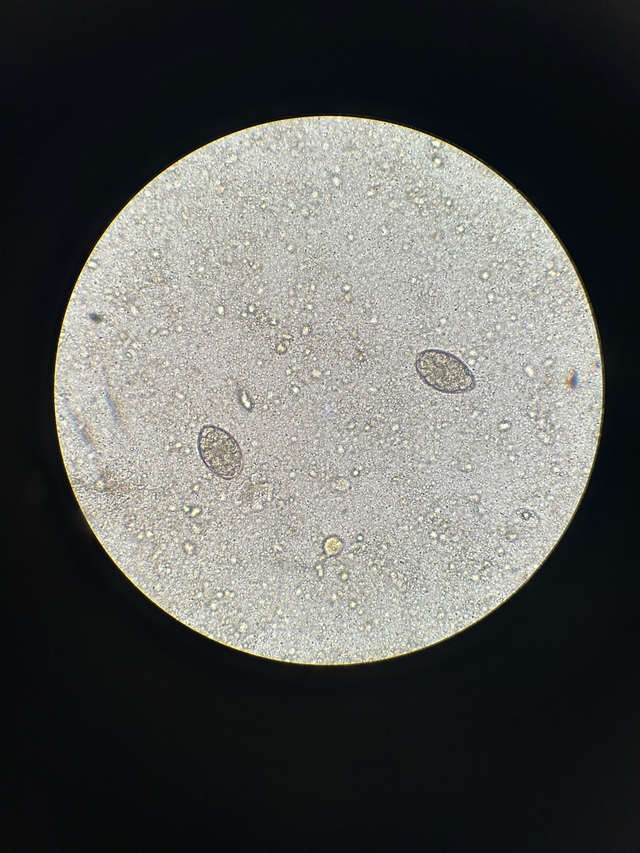 郊外の保護施設から譲り受けてきた、とても可愛らしいネコちゃん。「ずっと下痢が続いており、便と一緒に寄生虫が出てきた」とのことで来院されました。排泄された虫体(写真上)を拝見したところ、「マンソン裂頭条虫」と分かり、検便ではラグビーボール状の虫卵(写真上)が…。そこで、プラジクアンテルという駆虫薬を皮下注射することになりました。